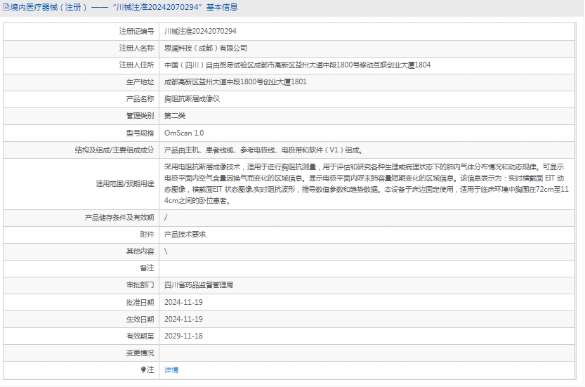 采用电阻抗断层成像技术,适用于进行胸阻抗测量,用于评估和研究各种生理或病理状态下的肺内气体分布情况和动态规律。可显示电极平面内空气含量因换气而变化的区域信息。显示电极平面内呼末肺容量短期变化的区域信息。该信息表示为:实时横截面 EIT 动态图像,横截面EIT 状态图像,实时阻抗波形,推导数值参数和趋势数据。本设备于床边固定使用,适用于临床环境中胸围在72cm至114cm之间的卧位患者。