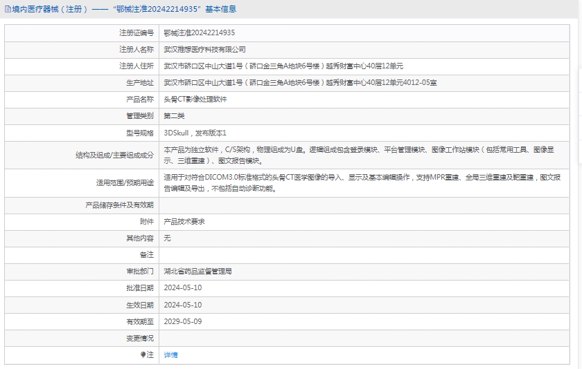 适用于对符合DM3.0标准格式的头骨CT医学图像的导入、显示及基本编辑操作,支持MPR重建、全局三维重建及靶重建,图文报告编辑及导出,不包括自动诊断功能。
