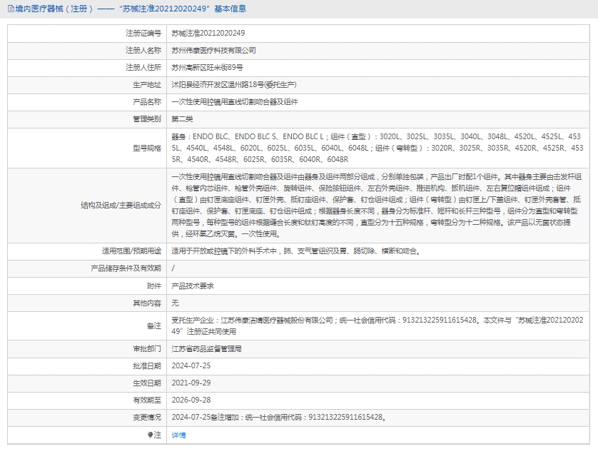 一次性使用腔镜用直线切割吻合器及组件由器身及组件两部分组成,分别单独包装,产品出厂时配1个组件。其中器身主要由击发杆组件、枪管内芯组件、枪管外壳组件、旋转组件、按钮组件、左右外壳组件、推进机构、组件、左右复位帽组件组成;组件(直型)由钉匣底座组件、钉匣外壳、抵钉座组件、保护套、钉仓组件组成;组件(弯转型)由钉匣上/下盖组件、钉匣外壳套管、抵钉座组件、保护套、钉匣底座、钉仓组件组成;根据器身长度不同,器身分为标准杆、短杆和长杆三种型号,组件分为直型和弯转型两种型号,每种型号的组件根据缝合长度和钛钉高度的不同,直型分为十五种规格,弯转型分为十二种规格。该产品以无菌状态提供,经灭菌。一次性使用。