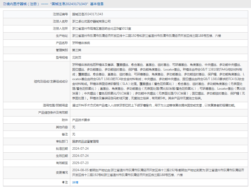 牙种植体系统包括种植体及套装、覆盖螺丝、愈合基台、直基台、临时基台、可研磨基台、角度基台、中央螺丝、多功能中央螺丝、固位螺丝、多功能基台、多功能临时基台、保护帽、多功能角度基台、Locator基台。种植体由符合GB/T 13810的TA4G纯钛材料制成;覆盖螺丝、愈合基台、直基台、临时基台、可研磨基台、角度基台、多功能基台、多功能临时基台、保护帽、多功能角度基台、Locator基台由符合GB/T 13810的TC4钛合金材料制成;中央螺丝、多功能中央螺丝、固位螺丝由符合GB/T 13810要求的TC4 ELI钛合金材料制成。种植体表面经喷砂酸蚀(SLA)处理。覆盖螺丝(着色阳极氧化);愈合基台、临时基台、多功能角度基台(无表面处理/着色阳极氧化);直基台、角度基台、多功能基台(无表面处理/氮化钛涂层/着色阳极氧化);可研磨基台、Locator基台(氮化钛涂层);中央螺丝(着色阳极氧化/DLC涂层);多功能中央螺丝(无表面处理/DLC涂层);固位螺丝、多功能临时基台、保护帽(无表面处理)。种植体及套装经伽马射线灭菌,无菌独立包装,有效期5年。其余产品非无菌独立包装。