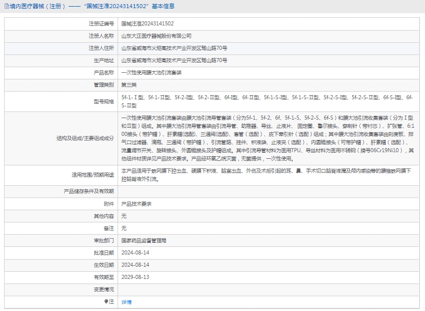 本产品适用于蛛网膜下腔、硬膜下积液、脑室、外伤及术后引起的耳、鼻、手术切口脑脊液漏及颅内感染等的腰椎蛛网膜下腔脑脊液外引流。