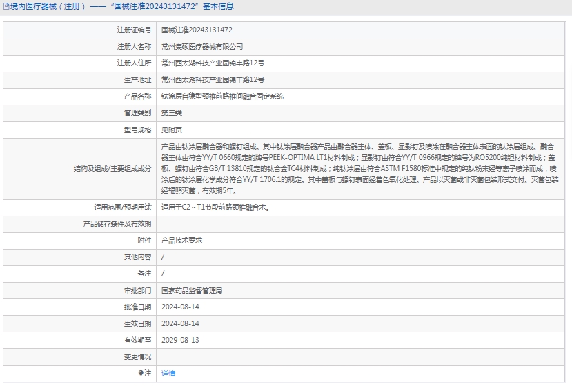 产品由钛涂层融合器和螺钉组成。其中钛涂层融合器产品由融合器主体、盖板、显影钉及喷涂在融合器主体表面的钛涂层组成。融合器主体由符合YY/T 0660规定的牌号PEEK-OPTIMA LT1材料制成;显影钉由符合YY/T 0966规定的牌号为RO5200纯钽材料制成;盖板、螺钉由符合GB/T 13810规定的钛合金TC4材料制成;纯钛涂层由符合ASTM F1580标准中规定的纯钛粉末经等离子喷涂而成,喷涂后的钛涂层化学成分符合YY/T 1706.1的规定。其中盖板与螺钉表面经着色氧化处理。产品以灭菌或非灭菌包装形式交付。灭菌包装经辐照灭菌,有效期5年。