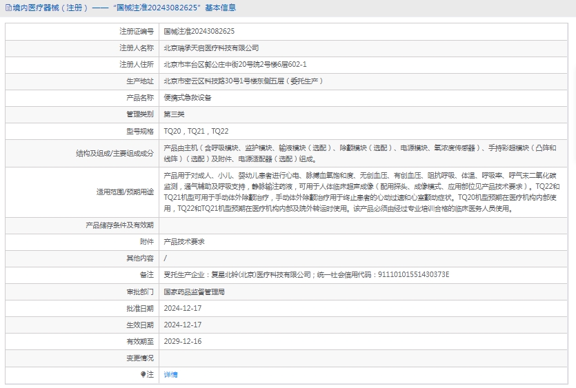 产品用于对成人、小儿、婴幼儿患者进行心电、脉搏血氧饱和度、无创血压、有创血压、阻抗呼吸、体温、呼吸率、呼气末二氧化碳监测,通气辅助及呼吸支持,静脉输注药液,可用于人体临床超声成像(配用探头、成像模式、应用部位见产品技术要求)。TQ22和TQ21机型可用于手动体外除颤治疗,手动体外除颤治疗用于终止患者的心动过速和心室颤动症状。TQ20机型预期在医疗机构内部使用,TQ22和TQ21机型预期在医疗机构内部及院外转运时使用。该产品必须由经过培训合格的临床医务人员使用。