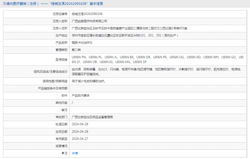 由光源、控制装置、出光口、闪光键、电源开关键/档位调节键、档位等级指示灯、冰敷指示灯、连闪指示灯、脱毛感应灯、电源线、适配器及护目镜组成。