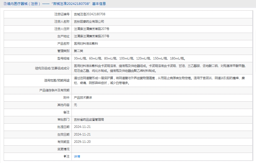 医用妇科液体敷料由卡波姆溶液、储液瓶及供给器组成。卡波姆溶液由卡波姆、甘油、三、依地酸二钠、对羟基苯甲酯、尼泊金乙酯、纯化水制成。储液瓶及供给器由聚材料制成。