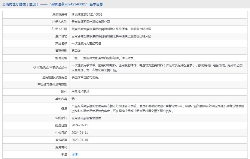一次性使用、医用纱布敷料、医用脱脂棉球、弯盘等为主要材料(详见附录组件配置表),按使用设计组合而成。经灭菌处理,为一次性使用无菌产品。
