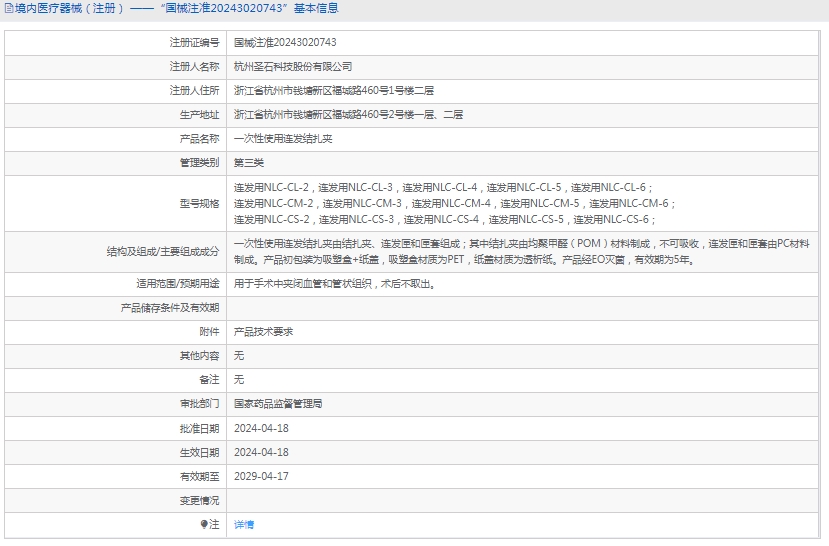 一次性使用连发结扎夹由结扎夹、连发匣和匣套组成;其中结扎夹由均聚(POM)材料制成,不可吸收,连发匣和匣套由PC材料制成。产品初包装为吸塑盒+纸盖,吸塑盒材质为PET,纸盖材质为透析纸。产品经EO灭菌,有效期为5年。