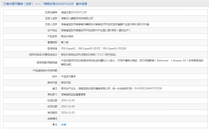 产品供医疗机构记录眼球活动轨迹和瞳孔大小变化,可用于精神分裂症、阿尔茨海默病(Alzheimer’s disease, AD)的早期筛选和辅助诊断。