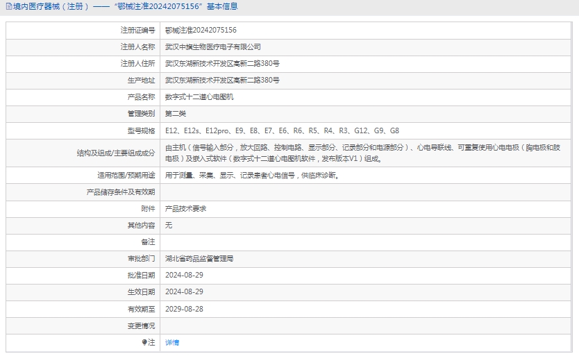 由主机(信号输入部分,放大回路、控制电路、显示部分、记录部分和电源部分)、心电导联线、可重复使用(胸电极和肢电极)及嵌入式软件(数字式十二道心电图机软件,发布版本V1)组成。