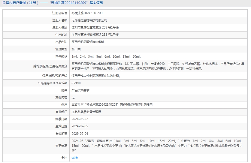 医用透明质酸钠液体敷料由透明质酸钠、1,3-丁二醇、甘油、卡波姆940、三、对羟基苯乙酮、纯化水组成,产品所含组分不具有药理学作用,不可被人体吸收,由西林瓶灌装。该产品以无菌状态提供,经湿热灭菌,一次性使用。