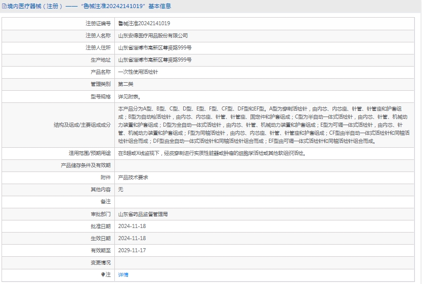 本产品分为A型、B型、C型、D型、E型、F型、CF型、DF型和EF型。A型为穿刺活检针,由内芯、内芯座、针管、针管座和护套组成;B型为自动枪活检针,由内芯、内芯座、针管、针管座、固定件和护套组成;C型为半自动一体式活检针,由内芯、针管、机械动力装置和护套组成;D型为全自动一体式活检针,由内芯、针管、机械动力装置和护套组成;E型为可调一体式活检针,由内芯、针管、机械动力装置和护套组成;F型为同轴活检针,由内芯、内芯座、针管、针管座和护套组成;CF型由半自动一体式活检针和同轴活检针组合而成;DF型由全自动一体式活检针和同轴活检针组合而成;EF型由可调一体式活检针和同轴活检针组合而成。