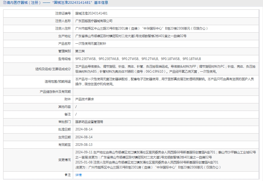 本产品由导液接头、调节旋钮、针座、壳体、针管、负压抽吸端组成。导液接头材料为PP;调节旋钮材料为PC;针座、壳体、负压抽吸端材料为ABS;针管材料为奥氏体不锈钢(牌号:06Cr19Ni10)。产品经灭菌,一次性使用。