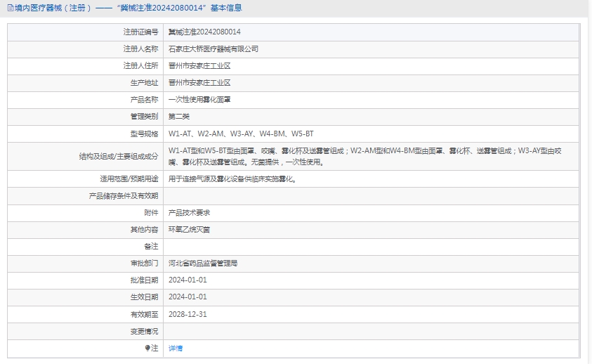 W1-AT型和W5-BT型由面罩、咬嘴、雾化杯及送雾管组成;W2-AM型和W4-BM型由面罩、雾化杯、送雾管组成;W3-AY型由咬嘴、雾化杯及送雾管组成。无菌提供,一次性使用。