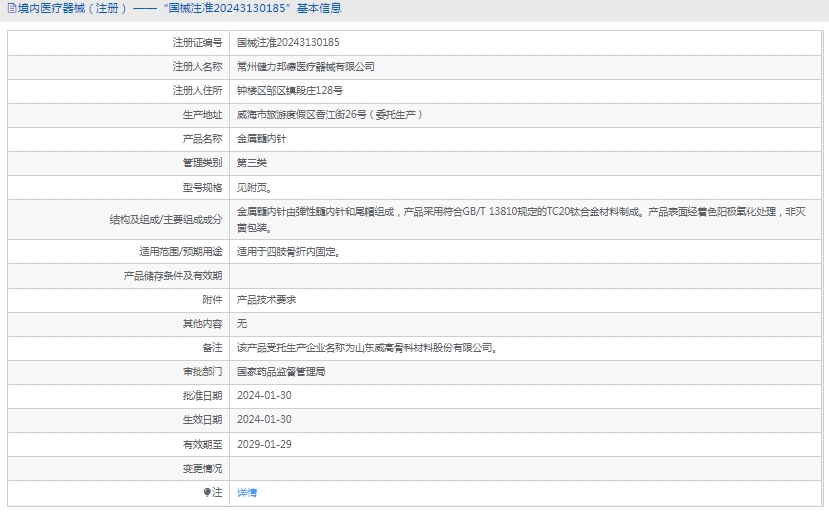 金属髓内针由弹性髓内针和尾帽组成,产品采用符合GB/T 13810规定的TC20钛合金材料制成。产品表面经着色阳极氧化处理,非灭菌包装。