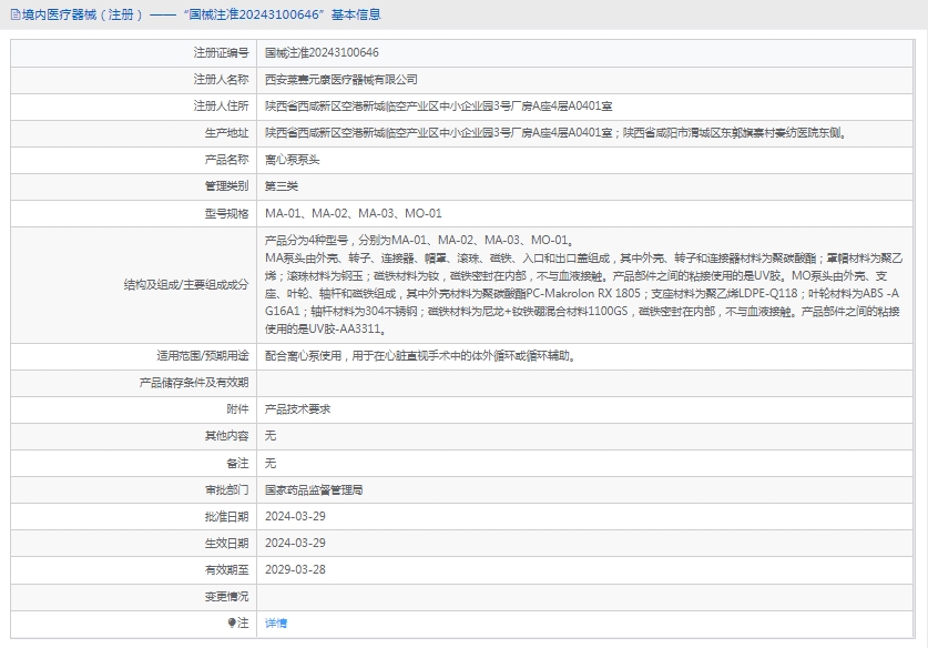 MA泵头由外壳、转子、连接器、帽罩、滚珠、磁铁、入口和出口盖组成,其中外壳、转子和连接器材料为聚碳酸酯;罩帽材料为聚;滚珠材料为钢玉;磁铁材料为钕,磁铁密封在内部,不与血液接触。产品部件之间的粘接使用的是UV胶。MO泵头由外壳、支座、叶轮、轴杆和磁铁组成,其中外壳材料为聚碳酸酯PC-Makrolon RX 1805;支座材料为聚LDPE-Q118;叶轮材料为ABS -AG16A1;轴杆材料为304不锈钢;磁铁材料为尼龙+钕铁硼混合材料1100GS,磁铁密封在内部,不与血液接触。产品部件之间的粘接使用的是UV胶-AA3311。