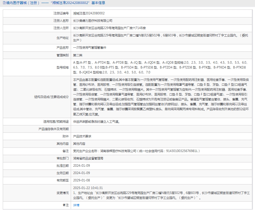 本产品由基本配置和选配配置组成,其中基本配置为:一次性使用气管插管、一次性使用配药用注射器、医用检查手套、一次性使用、医用纱布块、医用胶带、一次性使用吸引连接管。选配配置为:一次性使用喉罩气道导管、口垫 B 型、牙垫、口垫 F 型(口咽通气道)、二氧化碳吸收剂、石蜡棉球、一次性使用喉镜片。其中一次性使用气管插管为自制件;一次性使用配药用注射器、医用检查手套、一次性使用、一次性使用喉罩气道导管、医用纱布块、医用胶带、口垫 B 型、牙垫、口垫 F 型(口咽通气道)、一次性使用吸引连接管、一次性使用喉镜片、二氧化碳吸收剂、石蜡棉球为外购有注册证或备案证产品。普通型气管插管由管体、接头、套囊、充气管、指示球囊和单向阀以及导丝组成;由加强钢丝管体(内嵌钢丝)、接头、套囊、充气管、指示球囊和单向阀以及导丝组成,其中管体、充气管、套囊、指示球囊采用软聚塑料,接头、单向阀采用聚专用料制成。产品除吸收剂外其他的部分经灭菌,应无菌。