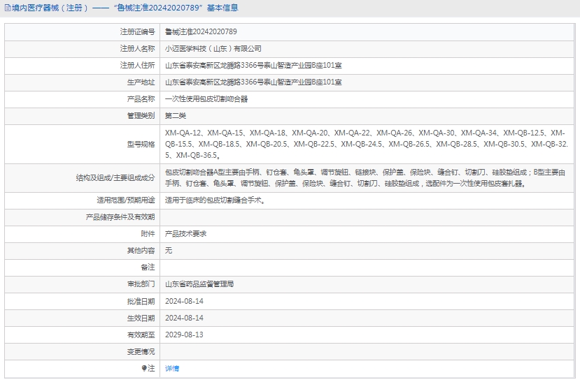 包皮切割吻合器A型主要由手柄、钉仓套、龟头罩、调节旋钮、链接块、保护盖、块、缝合钉、切割刀、硅胶垫组成;B型主要由手柄、钉仓套、龟头罩、调节旋钮、保护盖、块、缝合钉、切割刀、硅胶垫组成,选配件为一次性使用包皮。