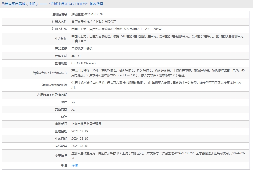 产品由印模仪手持件、常规扫描头、侧面扫描头、后牙扫描头、WiFi适配器、手持件充电座、电源适配器、颜色校准装置、电池、备用电源线、采集软件(发布版本IS ScanFlow 1.0)、嵌入式软件(发布版本1.0)组成。