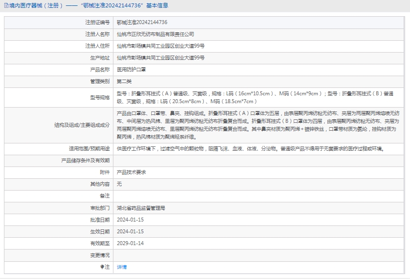 型号:折叠形耳挂式(A)普通级、灭菌级,规格:L码(16cm*10.5cm)、M码(14cm*9cm);型号:折叠形耳挂式(B)普通级、灭菌级,规格:L码(20.5cm*8cm)、M码(18.5cm*7cm)