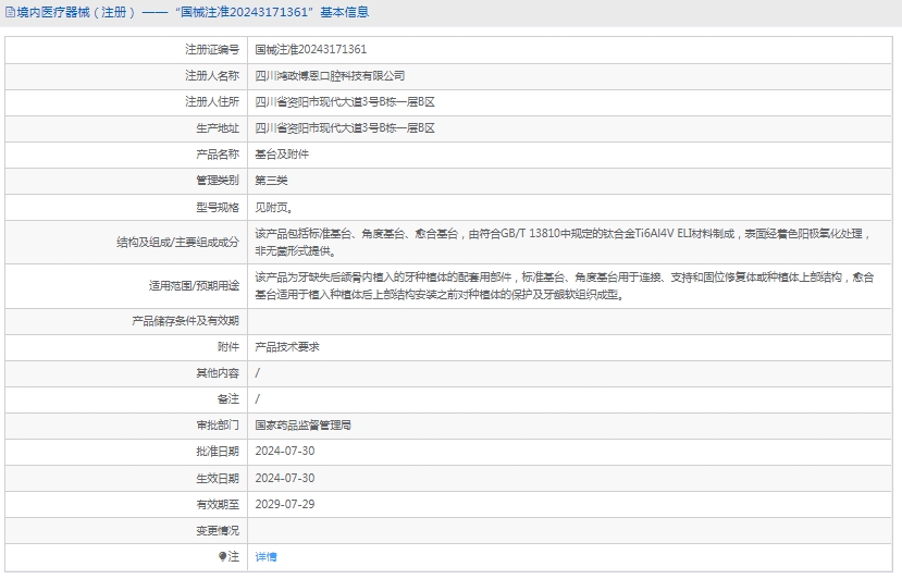 该产品包括标准基台、角度基台、愈合基台,由符合GB/T 13810中规定的钛合金Ti6Al4V ELI材料制成,表面经着色阳极氧化处理,非无菌形式提供。