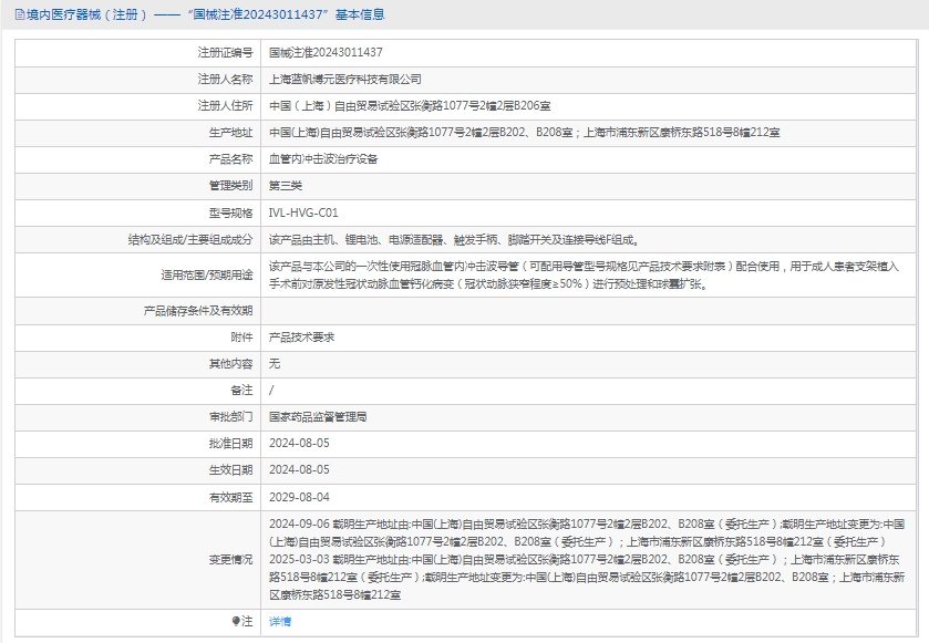 该产品与本公司的一次性使用冠脉血管内冲击波导管(可配用导管型号规格见产品技术要求附表)配合使用,用于成人患者支架植入手术前对原发性冠状动脉血管钙化病变(冠状动脉狭窄程度≥50%)进行预处理和球囊扩张。