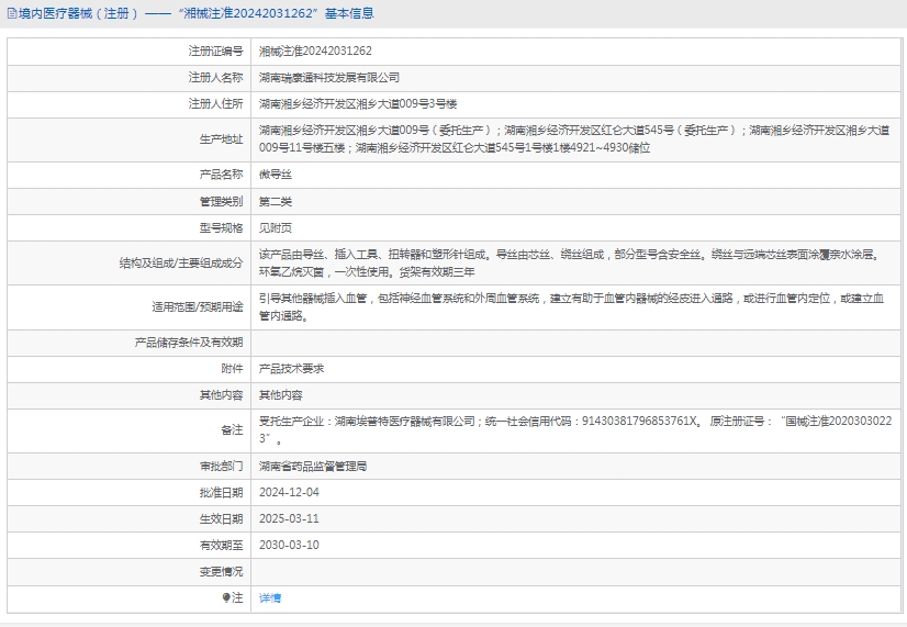 该产品由导丝、插入工具、扭转器和塑形针组成。导丝由芯丝、绕丝组成,部分型号含安全丝。绕丝与远端芯丝表面涂覆亲水涂层。灭菌,一次性使用。货架有效期三年