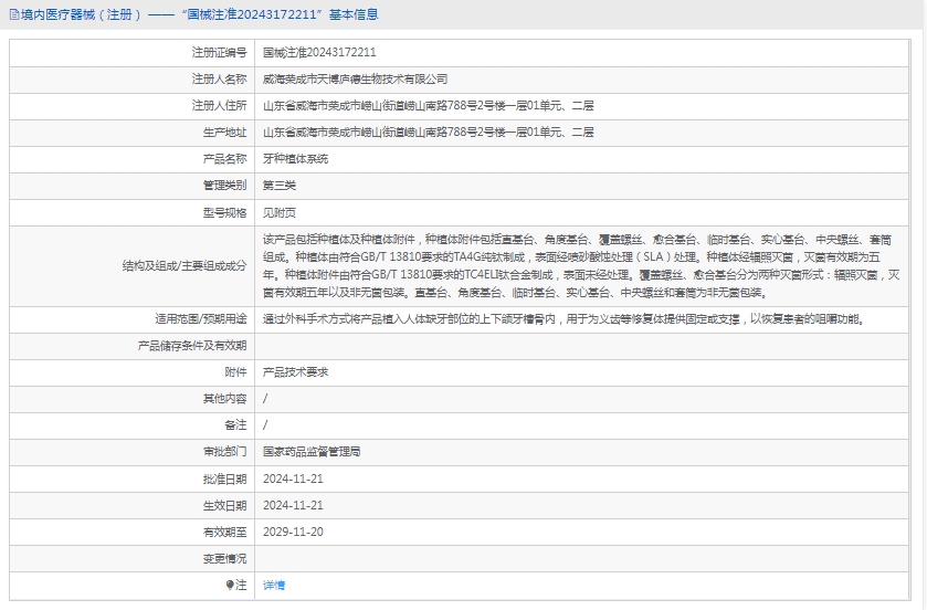 该产品包括种植体及种植体附件,种植体附件包括直基台、角度基台、覆盖螺丝、愈合基台、临时基台、实心基台、中央螺丝、套筒组成。种植体由符合GB/T 13810要求的TA4G纯钛制成,表面经喷砂酸蚀处理(SLA)处理。种植体经辐照灭菌,灭菌有效期为五年。种植体附件由符合GB/T 13810要求的TC4ELI钛合金制成,表面未经处理。覆盖螺丝、愈合基台分为两种灭菌形式:辐照灭菌,灭菌有效期五年以及非无菌包装。直基台、角度基台、临时基台、实心基台、中央螺丝和套筒为非无菌包装。