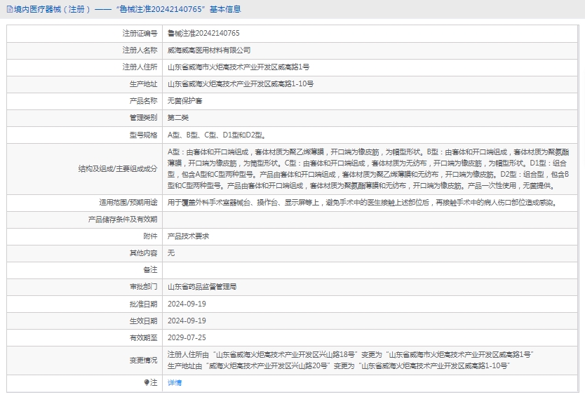 A型:由套体和开口端组成,套体材质为聚薄膜,开口端为橡皮筋,为帽型形状。B型:由套体和开口端组成,套体材质为聚氨酯薄膜,开口端为橡皮筋,为筒型形状。C型:由套体和开口端组成,套体材质为无纺布,开口端为橡皮筋,为帽型形状。D1型:组合型,包含A型和C型两种型号。产品由套体和开口端组成,套体材质为聚薄膜和无纺布,开口端为橡皮筋。D2型:组合型,包含B型和C型两种型号。产品由套体和开口端组成,套体材质为聚氨酯薄膜和无纺布,开口端为橡皮筋。产品一次性使用,无菌提供。