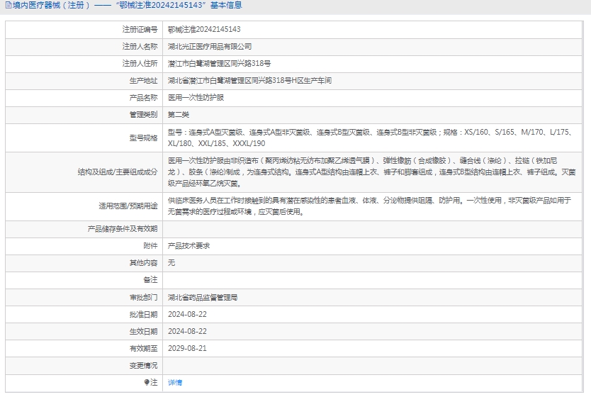 型号:连身式A型灭菌级、连身式A型非灭菌级、连身式B型灭菌级、连身式B型非灭菌级;规格:XS/160、S/165、M/170、L/175、XL/180、XXL/185、XXXL/190