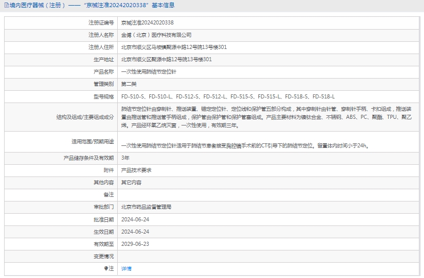 肺结节定位针由穿刺针、推送装置、锚定定位针、定位线和保护管五部分构成,其中穿刺针由针管、穿刺针手柄、卡扣组成,推送装置由推送管和推送管手柄组成,保护管由保护管和保护管塞组成。产品主要材料为镍钛合金、不锈钢、ABS、PC、聚酯、TPU、聚。产品经灭菌,一次性使用,有效期三年。
