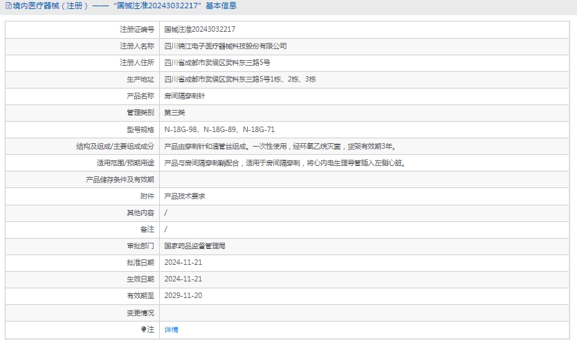 产品由穿刺针和通管丝组成。一次性使用,经灭菌,货架有效期3年。