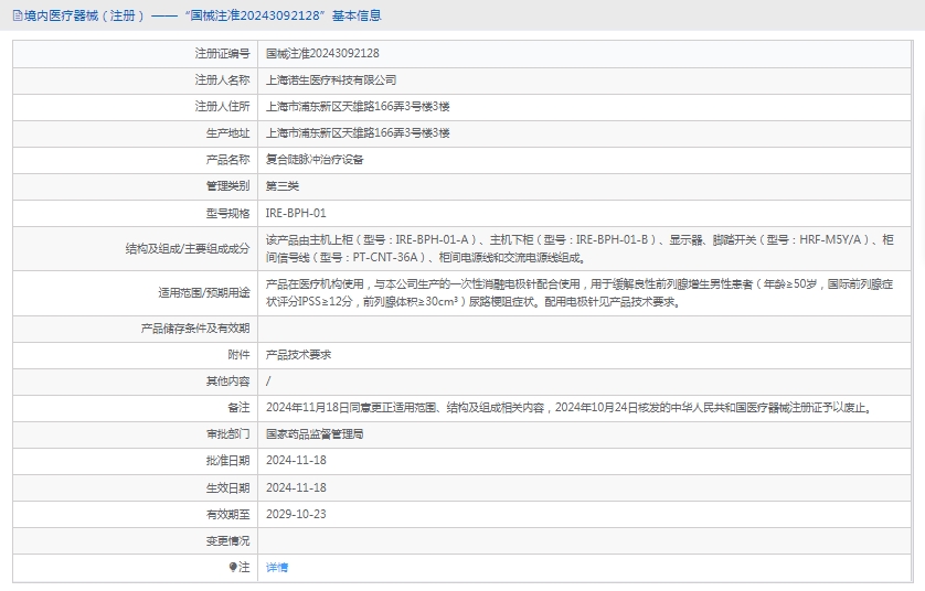 产品在医疗机构使用,与本公司生产的一次性消融电极针配合使用,用于缓解良性前列腺增生男性患者(年龄≥50岁,国际前列腺症状评分IPSS≥12分,前列腺体积≥30cm3)尿路梗阻症状。配用电极针见产品技术要求。