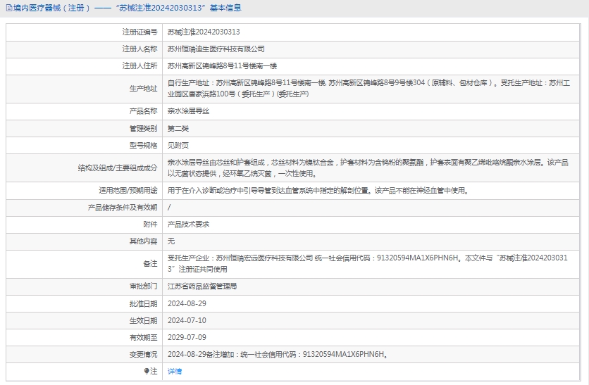 亲水涂层导丝由芯丝和护套组成,芯丝材料为镍钛合金,护套材料为含钨粉的聚氨酯,护套表面有聚烷酮亲水涂层。该产品以无菌状态提供,经灭菌,一次性使用。