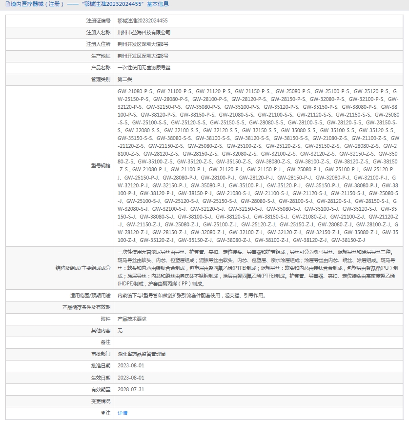 一次性使用无菌泌尿导丝由导丝、护套管、夹扣、定位接头、导直器和护套组成,导丝可分为斑马导丝、泥鳅导丝和涂层导丝三种。斑马导丝由软头、内芯、包塑层组成;泥鳅导丝由软头、内芯、包塑层、亲水涂层组成;涂层导丝由内芯、绕丝、涂层组成。斑马导丝:软头和内芯由镍钛合金制成,包塑层由聚四(PTFE)制成;泥鳅导丝:软头和内芯由镍钛合金制成,包塑层由聚氨酯(PU)制成;涂层导丝:内芯和绕丝由奥氏体不锈钢制成,涂层由聚四(PTFE)制成。护套管、导直器、夹扣、定位接头由高密度聚(HDPE)制成,护套由聚(PP)制成。