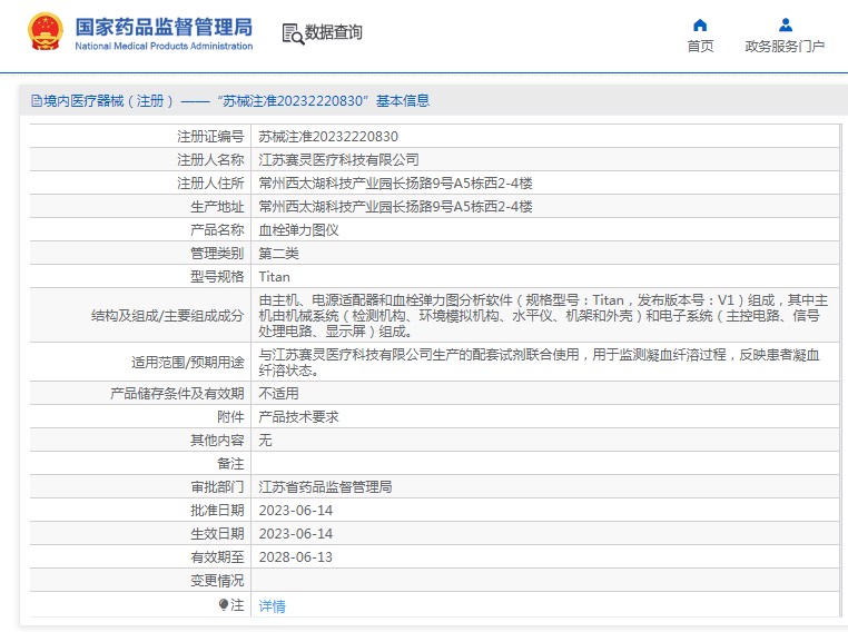 由主机、电源适配器和血栓弹力图分析软件(规格型号:Titan,发布版本号:V1)组成,其中主机由机械系统(检测机构、环境模拟机构、水平仪、机架和外壳)和电子系统(主控电路、信号处理电路、显示屏)组成。