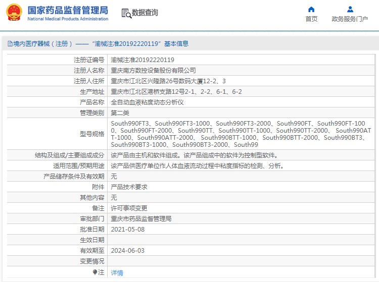 批准文号:渝械注准20192220119