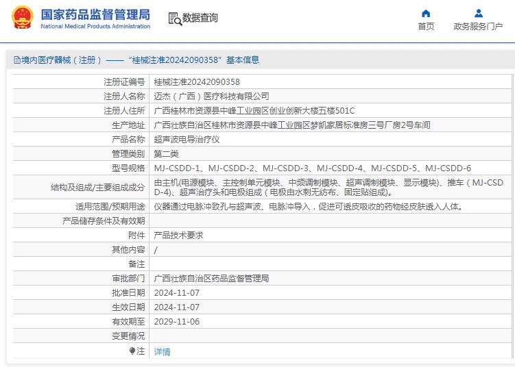 由主机(电源模块、主控制单元模块、中频调制模块、超声调制模块、显示模块)、推车(MJ-CSDD-4)、超声治疗头和电极组成(电极由水刺无纺布、固定贴组成)。