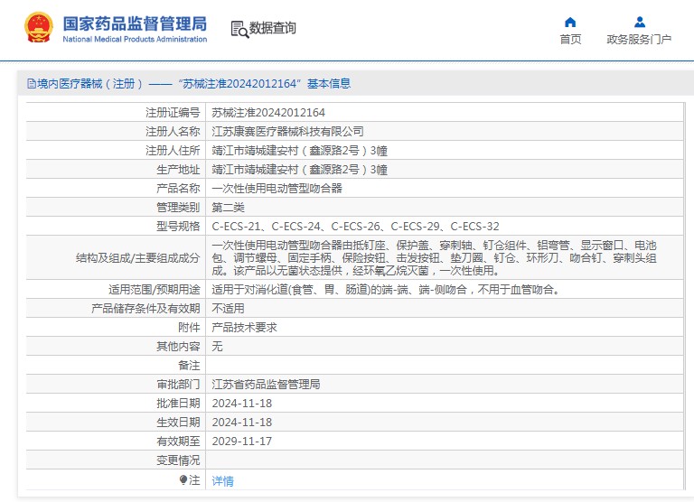 一次性使用电动管型吻合器由抵钉座、保护盖、穿刺轴、钉仓组件、铝弯管、显示窗口、电池包、调节螺母、固定手柄、按钮、击发按钮、垫刀圈、钉仓、环形刀、吻合钉、穿刺头组成。该产品以无菌状态提供,经灭菌,一次性使用。