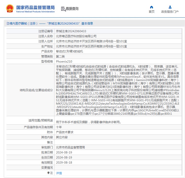 本移动式C形臂X射线机由组合式射线源(含组合式射线源机头、X射线管)、限束器、逆变单元、平板探测器、滤线栅、移动式C形臂机架、控制装置(含有线手持式开关、无线手持式开关(选配)、有线脚踏开关、无线脚踏开关(选配))、X射线影像系统(含计算机、显示器、图像采集处理软件)组成。图像采集处理软件的型号规格为PrecisionViewX,软件发布版本V1。具体信息如下:部件名称部件型号制造商组合式射线源(X射线源组件)Gemini3W奕瑞影像科技(海宁)有限公司组合式射线源机头(X射线管组件)M5W奕瑞影像科技(海宁)有限公司X射线管KL188奕瑞影像科技(海宁)有限公司逆变单元BQ3奕瑞影像科技(海宁)有限公司限束器RF801丹东市科大仪器有限公司平板探测器Mercu1212X上海奕瑞光电子科技股份有限公司滤线栅JPIGridndash;1000JPIHEALTHCARECO.,LTD.移动式C形臂机架WM-SG03-GT1北京唯迈医疗设备有限公司X射线影像系统WM-SG03-IPS1北京唯迈医疗设备有限公司控制装置有线手持式开关WM-SG01-HS1无线手持式开关(选配)WM-SG03-HS1有线脚踏开关WM-SG01-PD1无线脚踏开关(选配)MKF22S/2SSW2.4LE-MEDGP212steuteTechnologiesGmbHamp;Co.KGMKF22S/2SSW2.4LE-MEDGP211steuteTechnologiesGmbHamp;Co.KG注:X射线影像系统包含计算机、显示器、图像采集处理软件,计算机与显示器配置如下表:计算机内存ge;16GCPUIntelICoreII56500或以上硬盘容量ge;1TB显示器尺寸ge;27寸分辨率3840;2160亮度ge;500cd/m2对比度ge;800:1