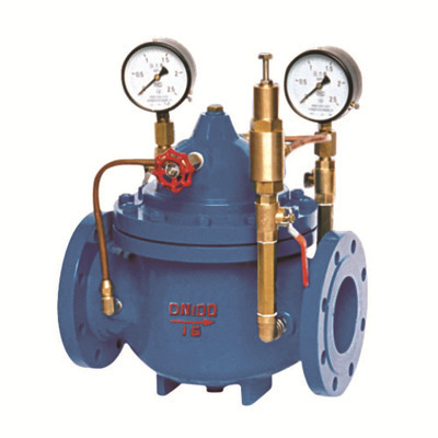 【活塞式可调式减压阀的变化】在主阀不变的情况下,通过针形阀、先导阀及相应 控制系统,根据管网中不同的要求,可演变出几十种功能的阀门,除上述5种给水系统常用的以外尚有电动浮球阀、水力电动控制阀、电磁控制阀、流量控制阀、紧急关闭阀等。均有不同的设计选用要求和安装要求。由于水利控制阀在作用方式上利用介质自身压力及液压系统操作,并能自动控制,动作准确,性能可靠,故在建筑给水(含消防)系统中广泛应用。分别介绍了遥控浮球阀、可调式减压阀、缓闭止回阀、泄压阀和 持压阀 等几种常用的水力控制阀的设计选用和安装要点。可调式减压阀是一种利用介质自身能量来调节管路的压力,通过调节减压导阀,控制主阀的出口压力,出口压力不因进口压力的变化而改变,亦不受出 口用水量的变化而改变出口压力。密封性能可靠,安装、维护、调试、检查方便,使用寿命长。