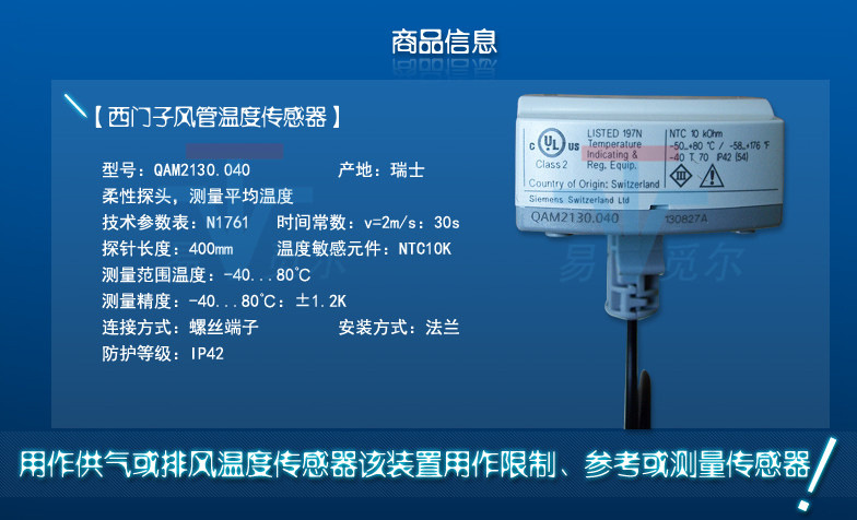 德国进口西门子Siemens 风管温度传感器QAM2130.040 40cm NTC 10k