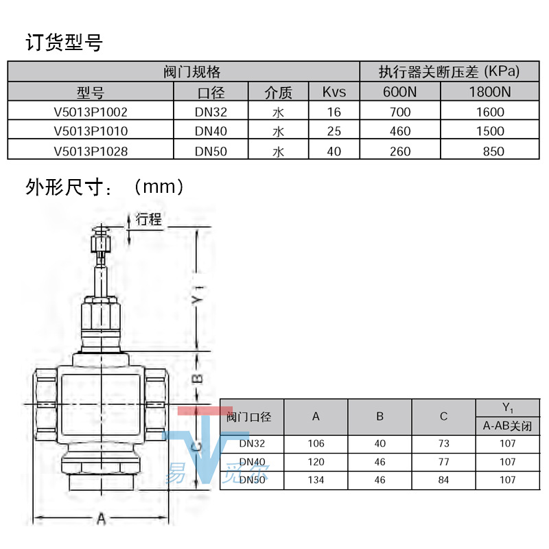 霍尼韦尔 HONEYWEII V5013P1002 V5013P1010三通比例调节阀 产品与型号尺寸图: