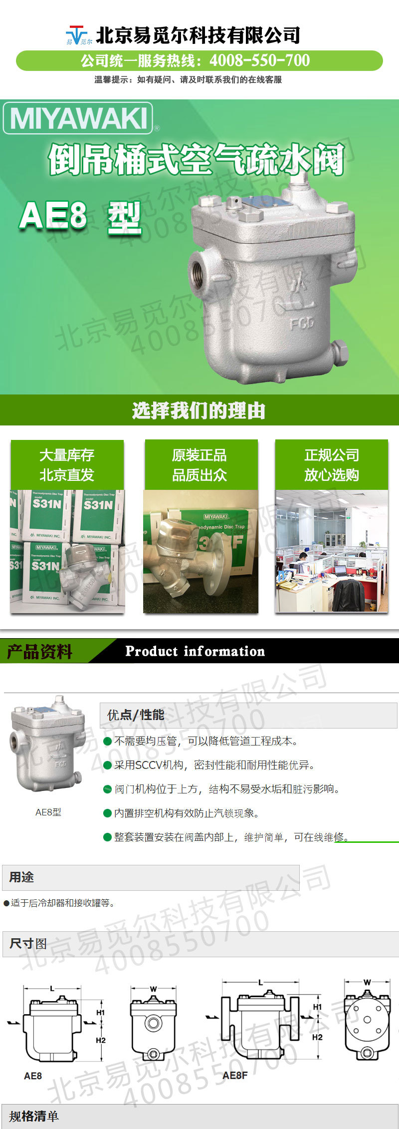 日本MIYAWAKI宫胁疏水阀 AE8/AE8F 倒吊桶式空气疏水阀 SCCV机构