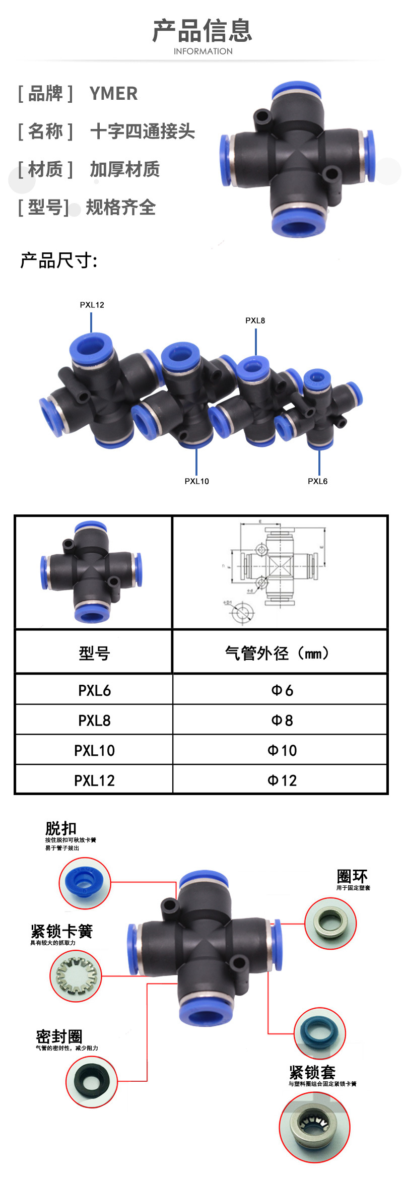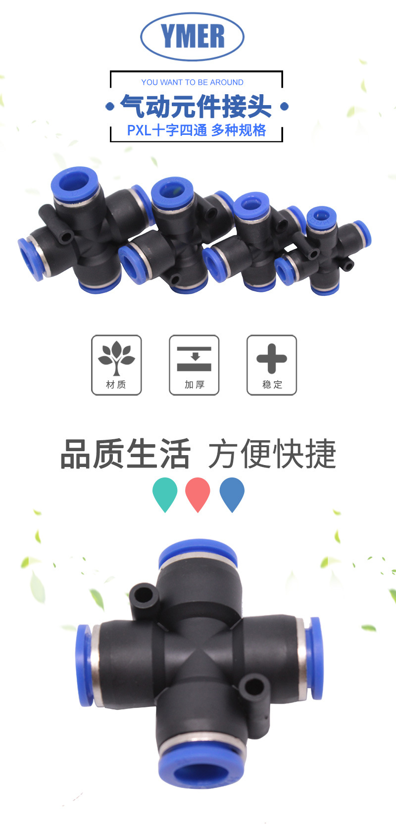 用途:用于气压配管的单触式管连接口,根据使用情况,可用于多种途径。