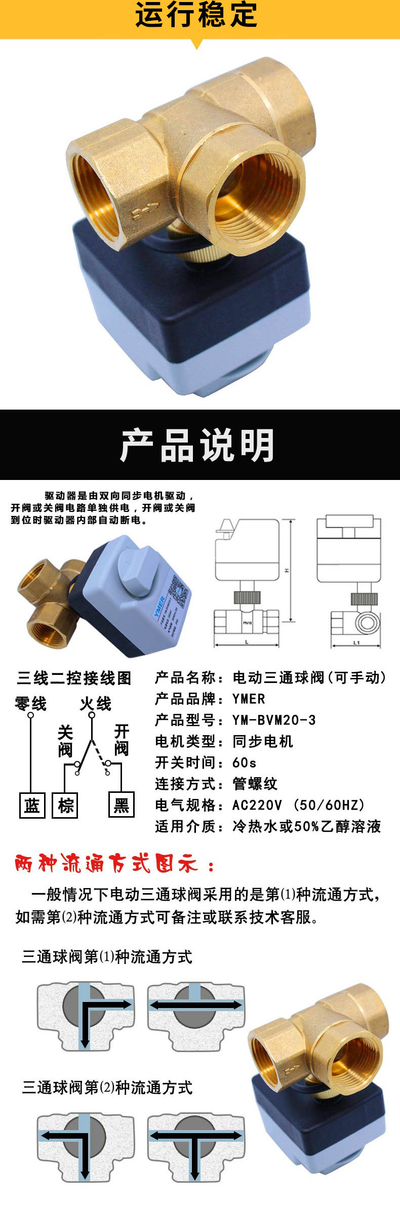 YMER 暖通空调电动三通球阀ac220v BVM220带手动功能电动开关阀