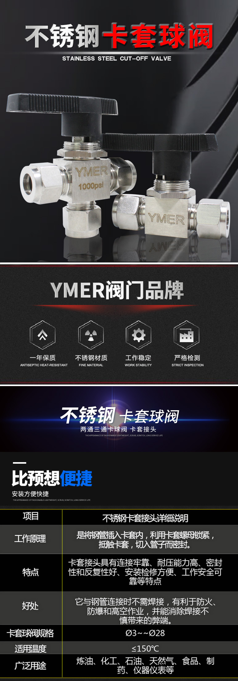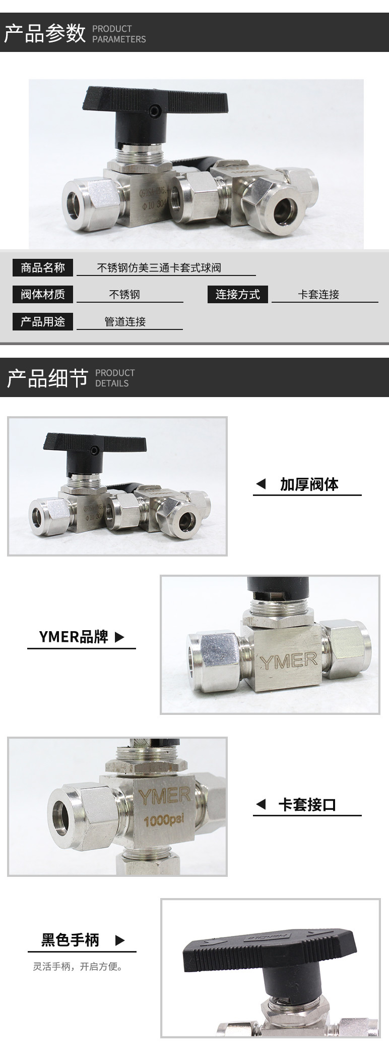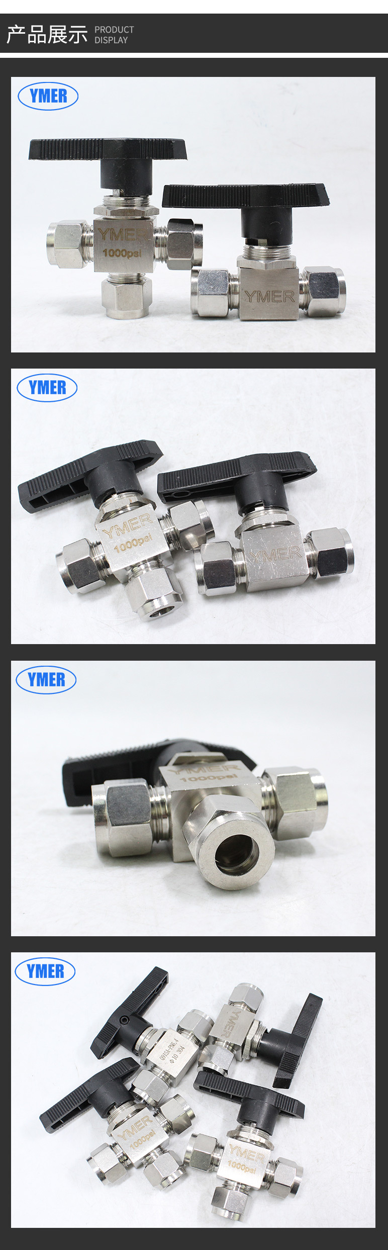 YMER不锈钢304卡套球阀 二通阀 高压1000psi三通球阀 仪表卡套阀