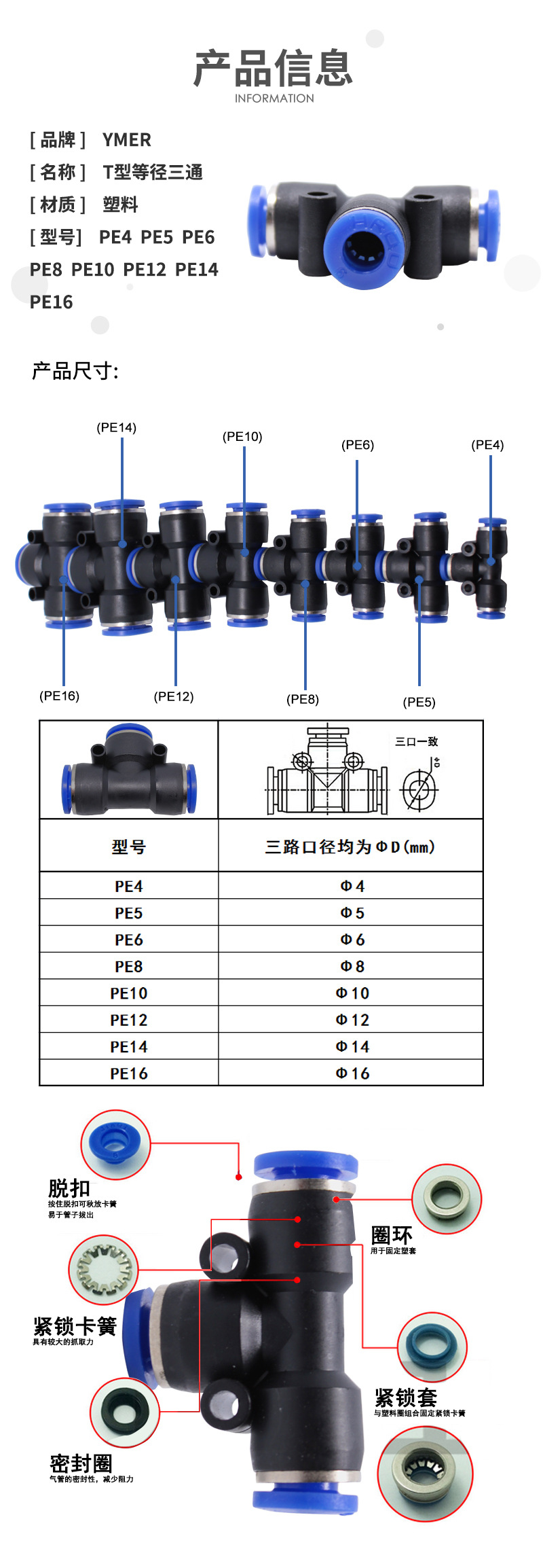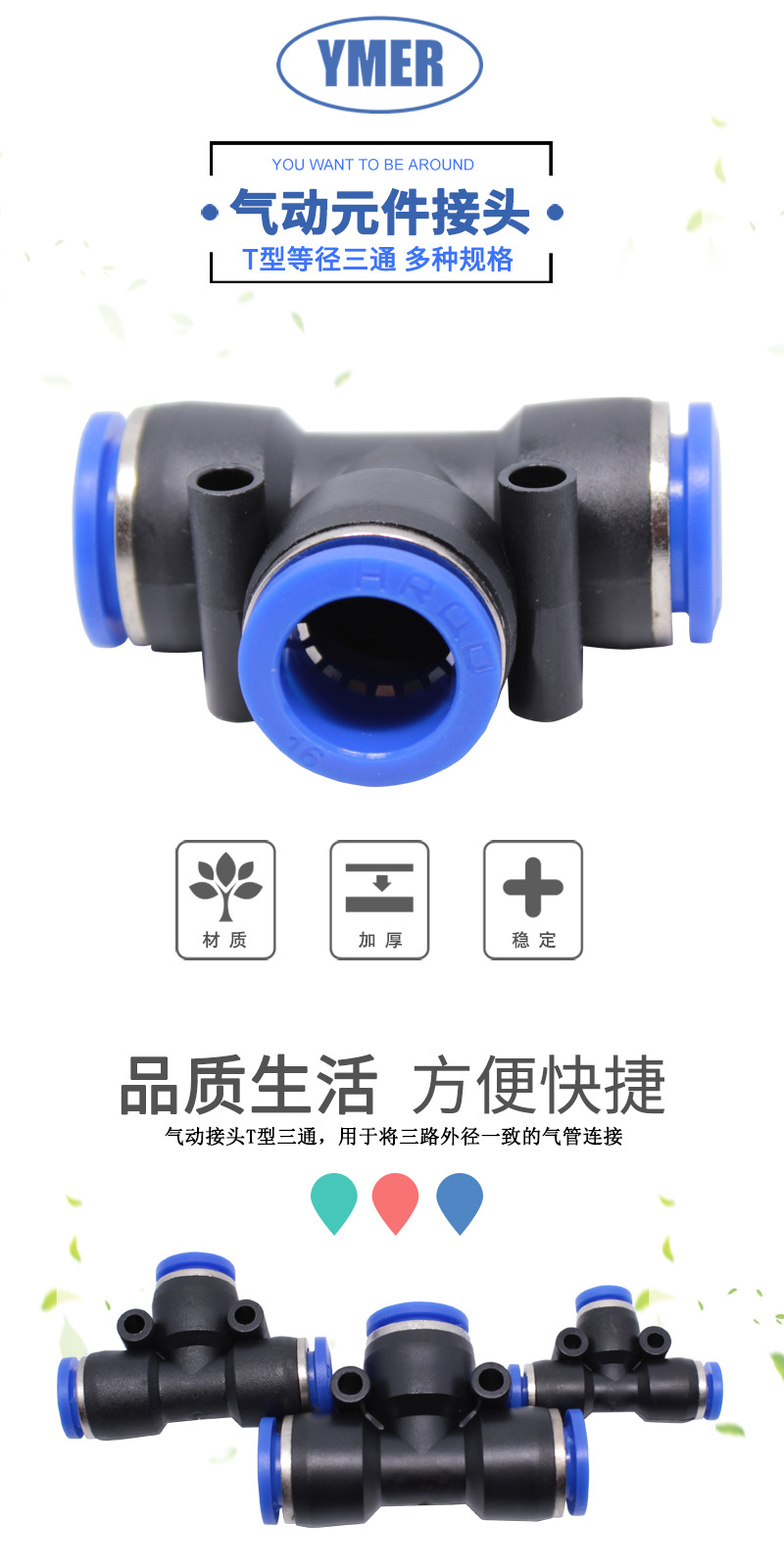 YMER 气管快速接头 PE10 软管三通塑料气动元件 T型三通等径插头