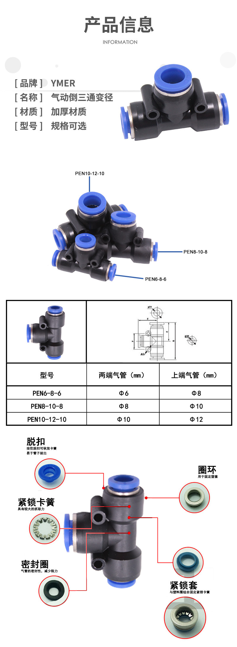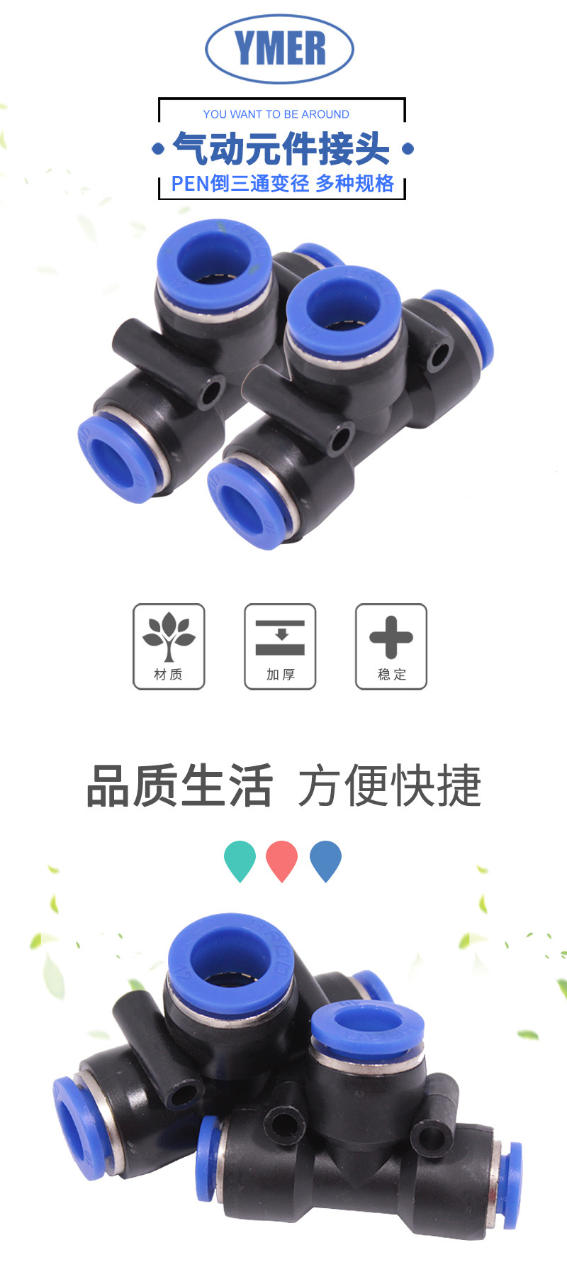 YMER 气动元件快插接头 塑料快接头 高压软管T型倒三通变径 PEN