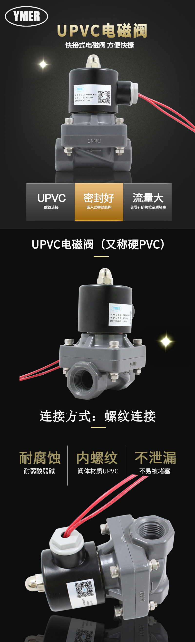 UPVC电磁阀 4分6分1寸普通走水螺纹开关阀 YM2WUB-S常闭气阀