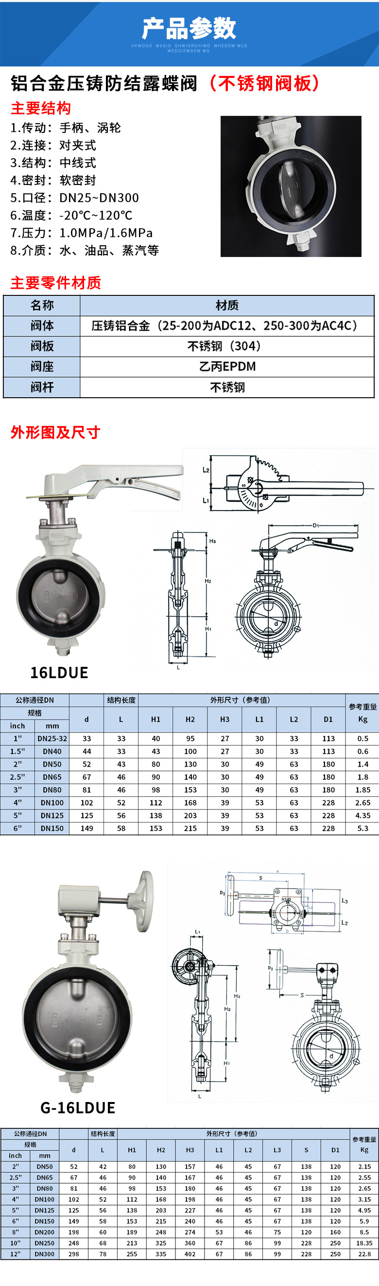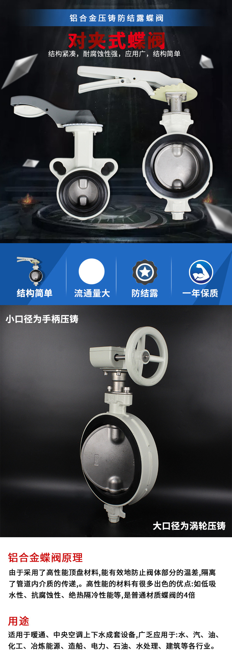 不锈钢阀板铝合金蝶阀防结露开关阀 对夹式手柄蝶阀dn50 dn100涡蜗轮蝶阀